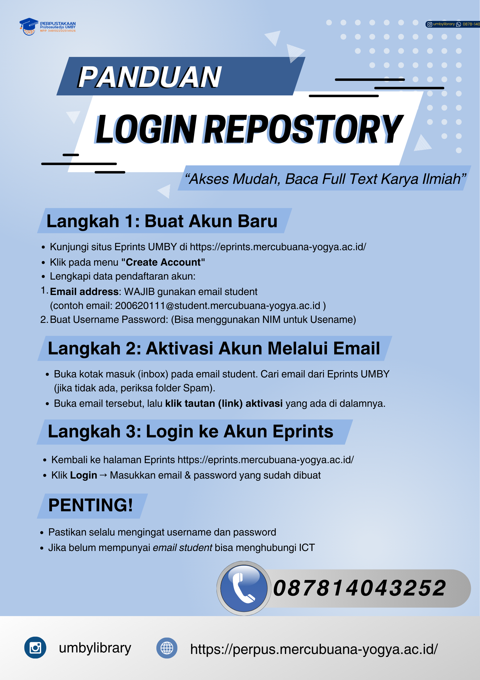 | 11 | Login Repository UMBY | Panduan cara login ke repository Universitas Mercu Buana Yogyakarta untuk mengakses Full text koleksi karya ilmiah. |